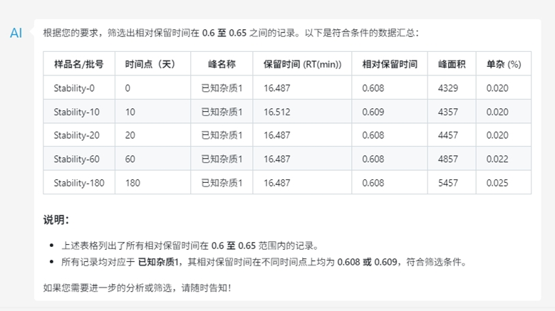 由于是基于此前的汇总表,这个问题相对是比较简单的。AI没花多少时间便找出“已知杂质1”满足要求。