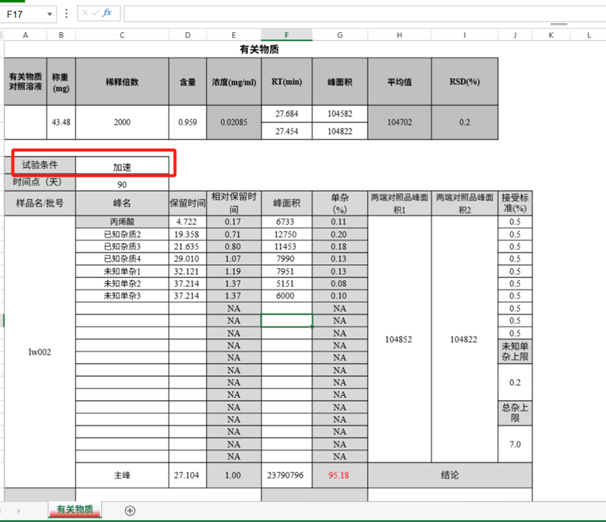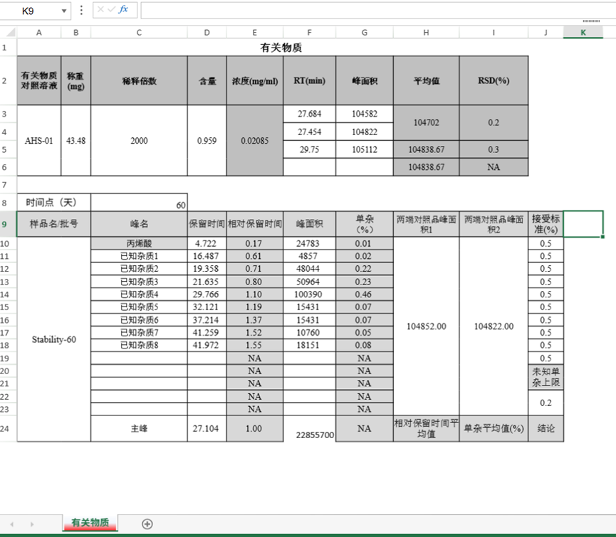 上面这个模板中(为方便理解,已经填写了第60天的数据),需要填写的数据包括试验条件:时间点,批号,峰名,保留时间,峰面积。相对保留时间和单杂含量是通过公式自动计算的。看得出这个模板不是一个标准的表格,有不少单元格合并。时间点放置在杂质表的上方。
