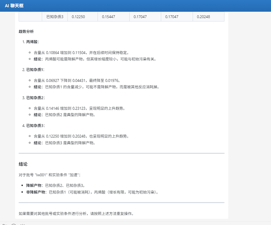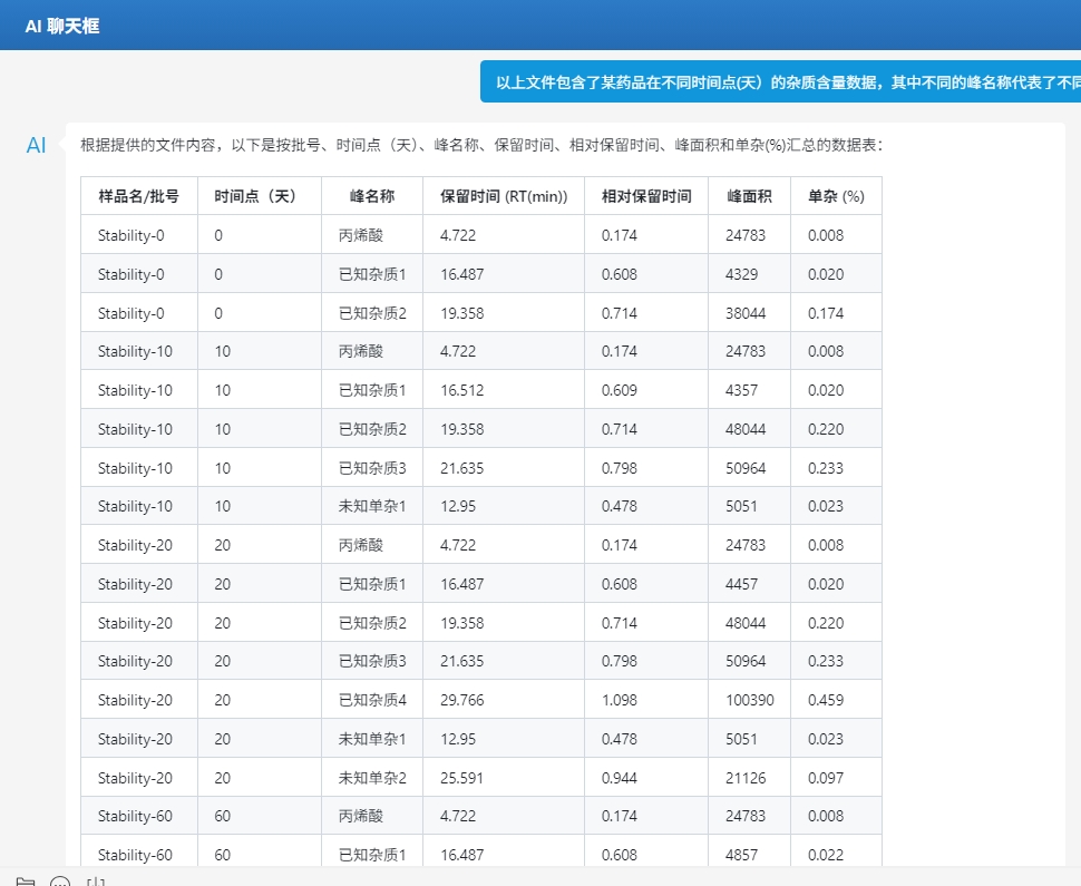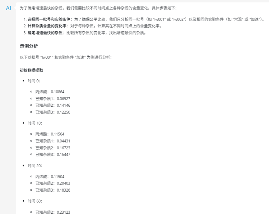 仅就这个问题来说,我们并没有给AI更多的信息,其自动按照同一批号和试验条件作答。AI在理解科学实验方面的能力还是可圈可点的。由于是在WindSheet自动汇总及去除无效数据的基础上提交AI分析,AI的回答非常迅速,不需要消耗过多的时间。且由 于提交数据的化繁为简,消耗的Token也急剧减少,使用AI的成本得到了极大的降低。