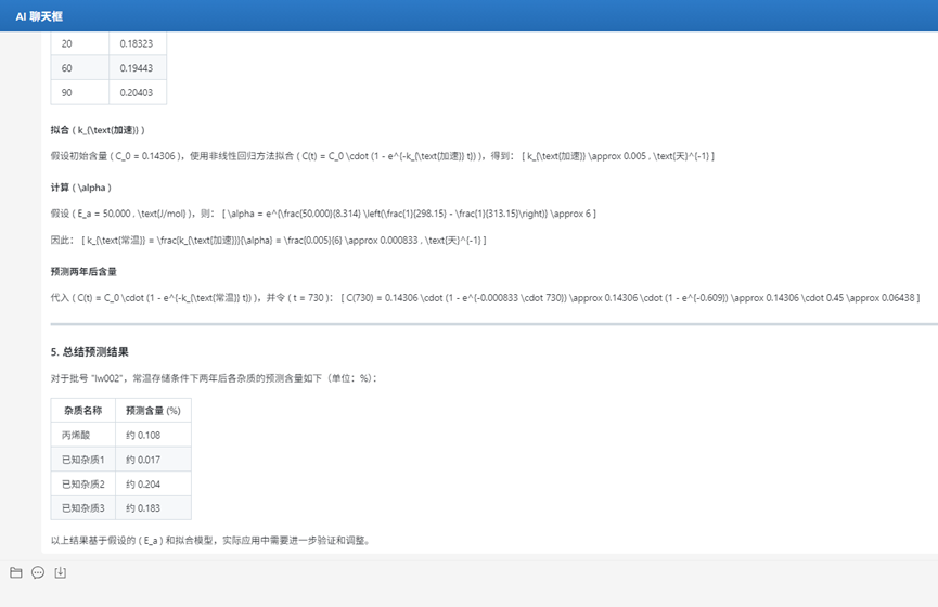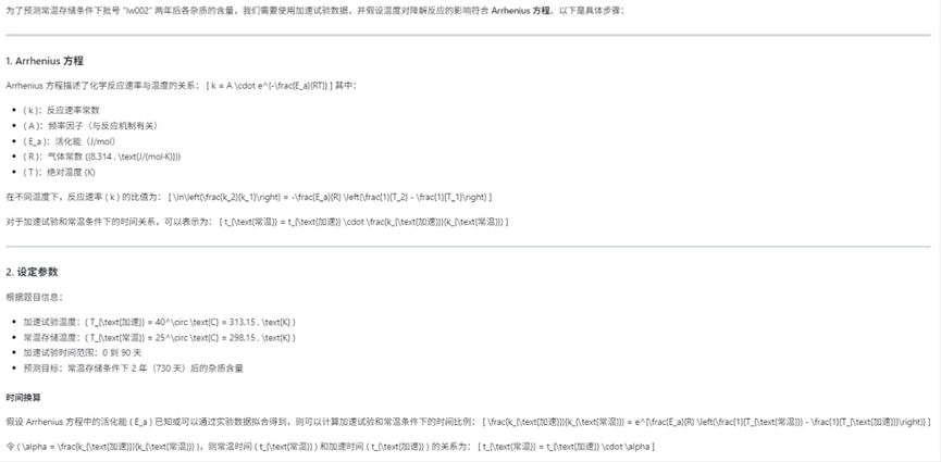 AI采用了阿伦尼乌斯方程进行加速稳定性计算,最后直接给出了3种杂质的计算结果。