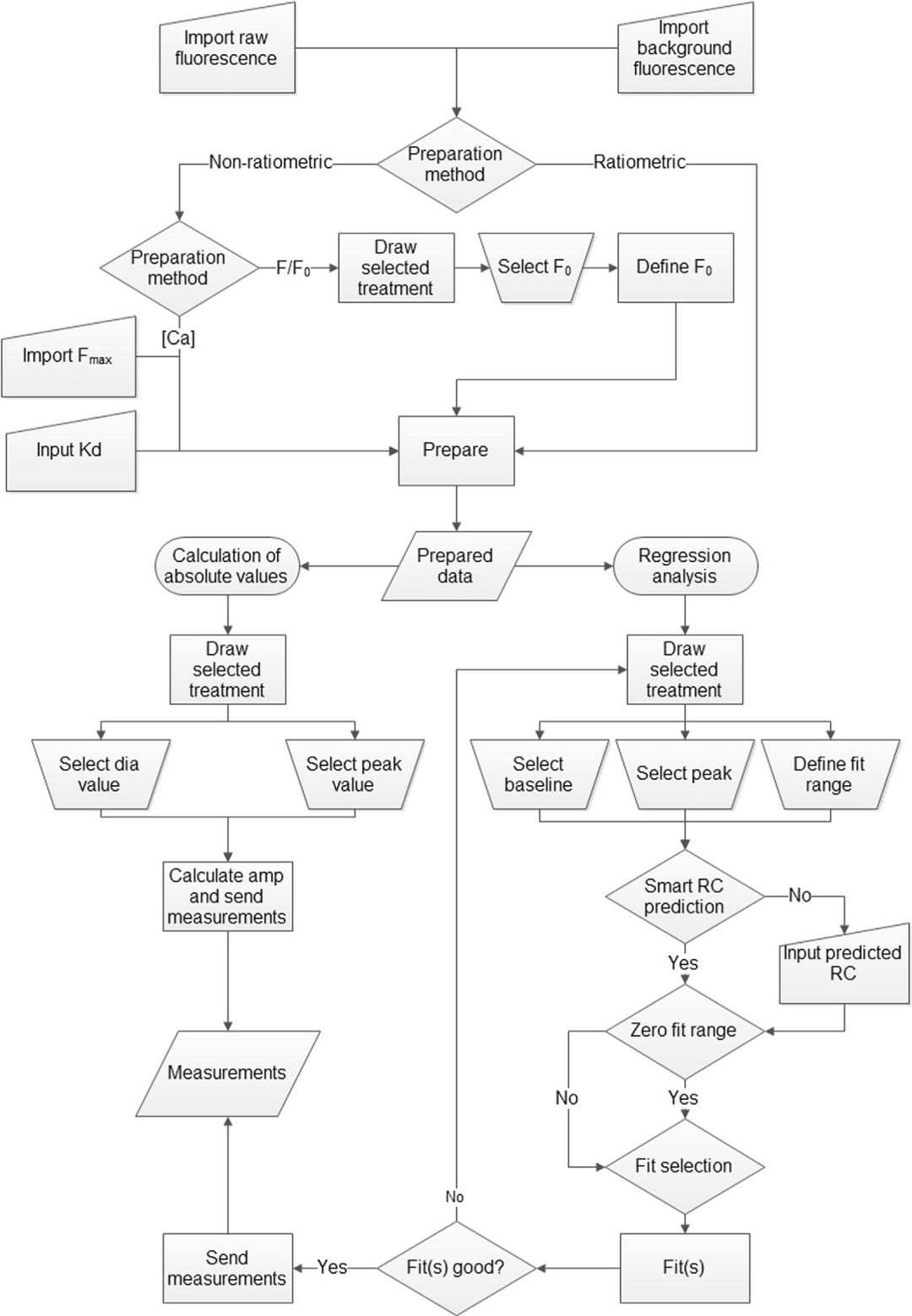 以细胞内钙瞬态分析为例,可以深切感受到整个处理流程的复杂,以及将整个流程分割到不同的软件中进行的弊端。如下图: