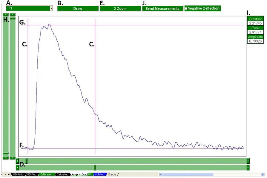 如上图:①选择参数;②点击Draw按钮计算钙瞬态绝对值曲线;③可以方便地在图中进行拖动和缩放;④可以方便查看舒张值、峰值及收缩值等。