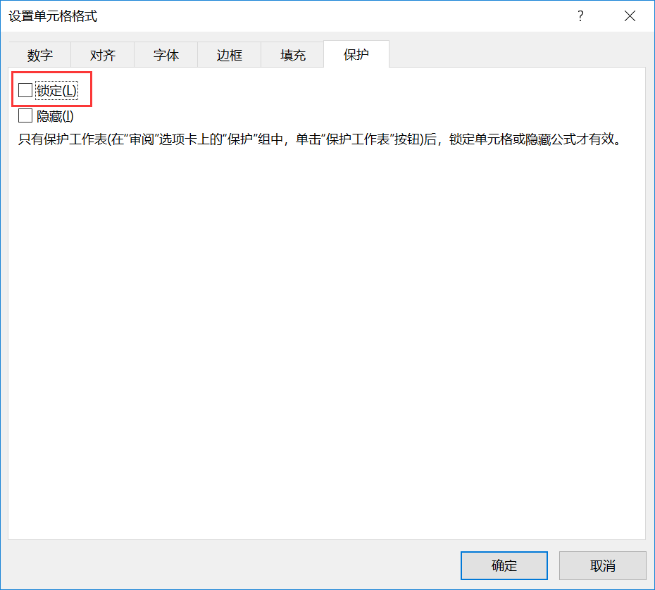 • 按快捷键”Ctrl+1″,弹出如下对话框,点击”保护”选项卡,取消勾选”锁定”,点击”确定”。