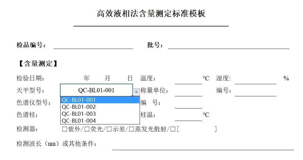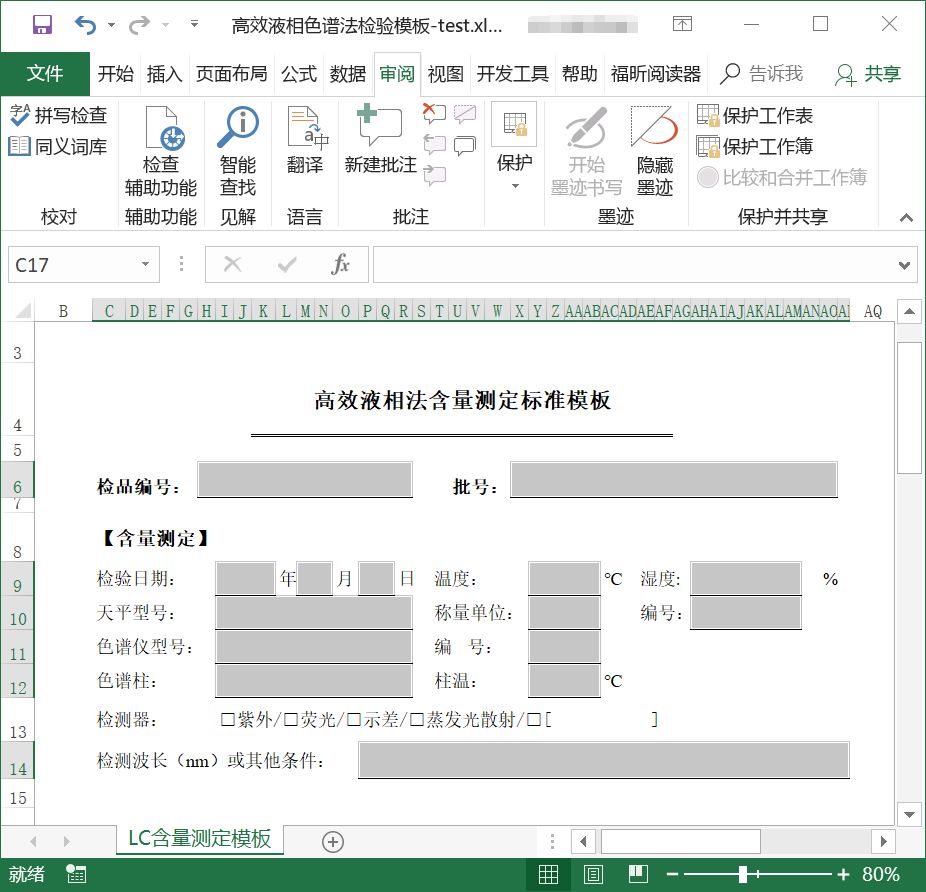 • 选中《高效液相色谱法含量测定标准模板》中需要输入信息的区域(浅灰色)。