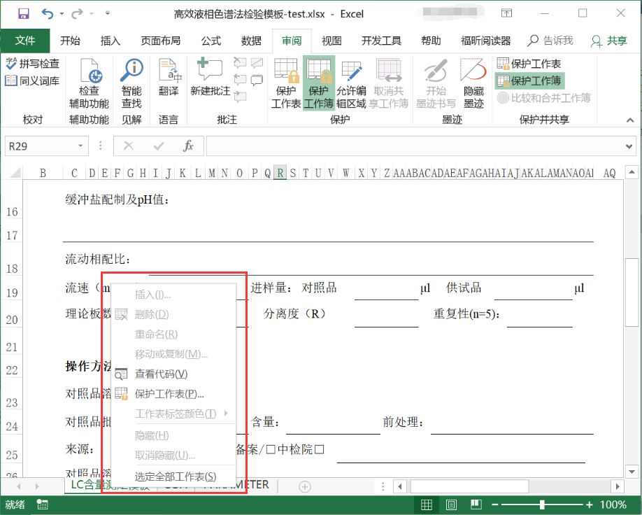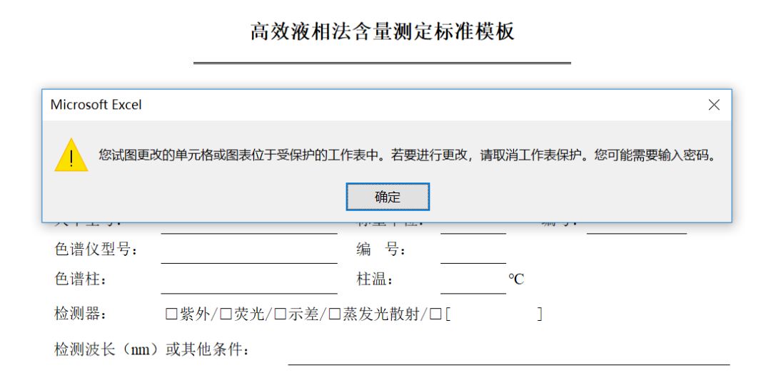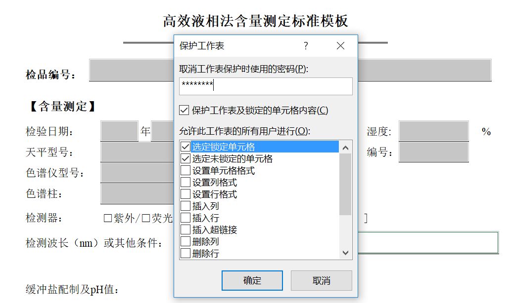 • 输入工作表保护密码(建议在标准操作规程中对密码长度和复杂度进行规定),此时整个工作表将被保护且无法修改。