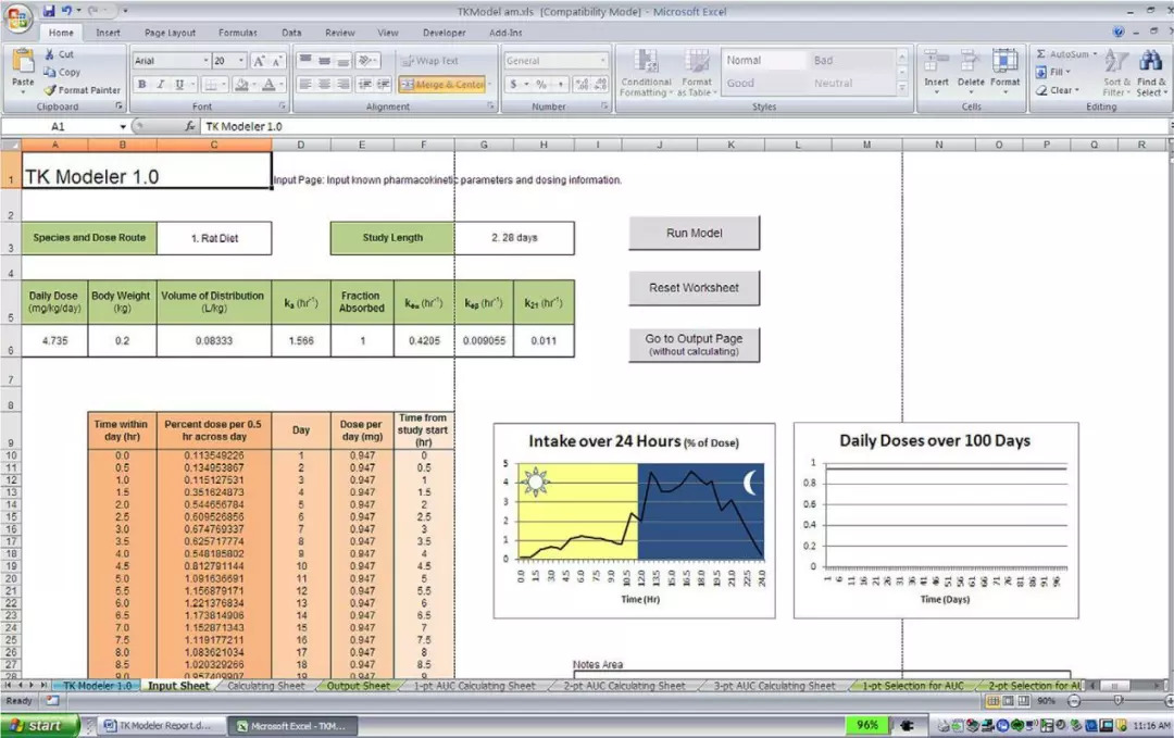 见下图一, “Input Sheet”工作表用于数据输入。表格左上方标题为绿色的单元格用于填入数据,包括物种类别及给药方式、研究周期、日剂量、体重、分布体积、吸收速率常数Ka等(祥见图1)。所有参数输入完毕后,工作表左下方区域橙色表会根据用户输入,显示出对应的日内或日间药物摄入量。日内及日间药物摄入量同时在表格右边以折线图显示。