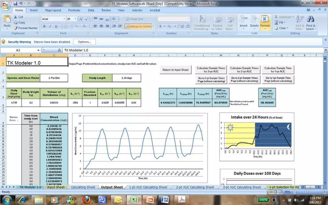 本文为大家介绍一款由陶氏化学开发的基于Excel的毒代研究实验设计辅助工具(TK Modeler)。该工具可以使用已知的药代动力学信息,预测单次或多次给药后,实验动物体内的血药浓度。基于血药浓度的预测,可以为多种研究目的提供辅助,比如确定获得不同暴露目标的给药方案(例如获得特定的Cmax、维持稳态的血药浓度……),比如选择合适的取样时间,等等。详细信息请查阅《Regulatory Toxicology and Pharmacology 63 (2012) 333–343》