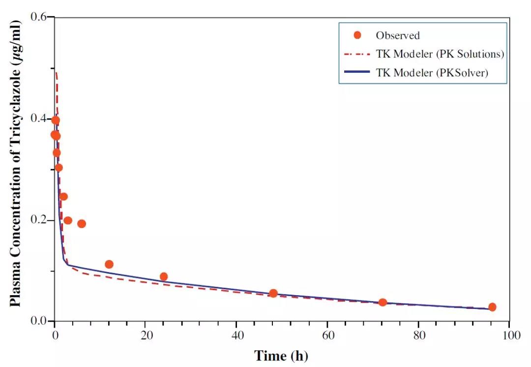 开发人员分别用TK Modeler两种不同处理方法的预测结果与实验数据进行对比,预测值基本与实验观测值吻合(不计药理实验不可避免的实验误差)。