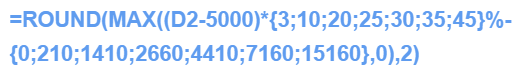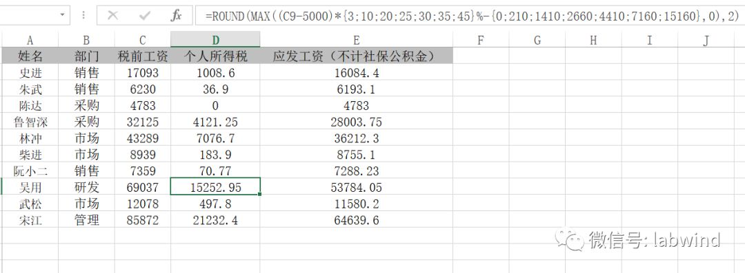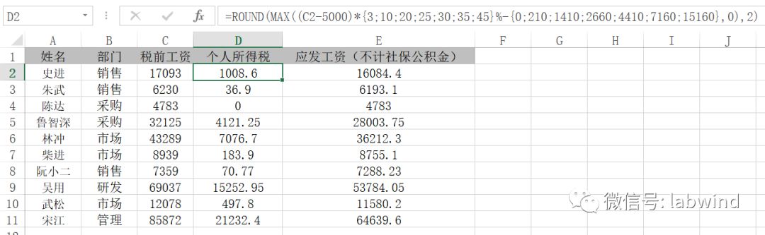 那么我们可以发现,当工资小于5000时,计算所得到的个税为负数。所以,我们需要在MAX函数中引入一个0作为”分水岭”,让所有负数值都显示为0。