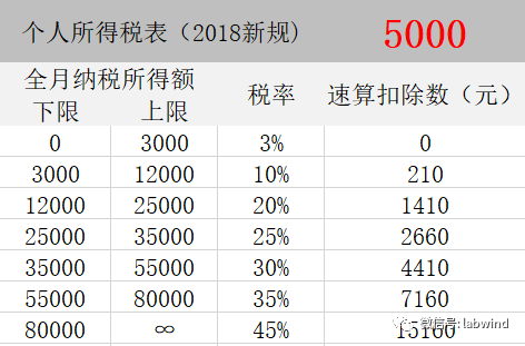 那么,个税的计算公式为:=(工资-5000)*对应级税率-对应级速算扣除数。