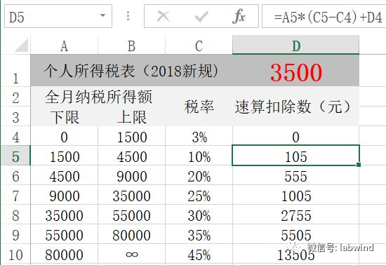 第一级速算扣除数(D4单元格)填入0,第二级速算扣除数(D5单元格)填入公式=A5*(C5-C4)+D4下拉即可,这个公式的意思就是扣除本级的下限(A5)乘以相邻两级税率的差(B5-B4),再加上上一级的速算扣除数。
