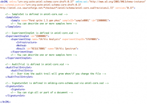 AnIML是基于W3C XML标准的技术。XML独立于平台,易于创建,使用和维护。这降低了使用门槛,几乎所有的主流软件开发商都支持XML,并且存在大量以XML格式为基础的工具。 由于XML是基于文本的。因此可以用最简单的文本编辑器编辑AnIML文件 – 而不需要特定的软件。尽管这样不一定方便,但保留这一特性是用于长期数据保存方案的关键:即使丢失了之前的软件,我们仍旧可以获取我们需要的数据。