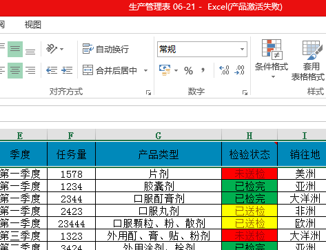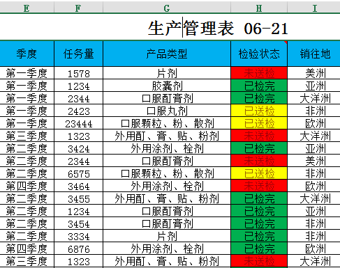 如上图一所示,标题”生产管理表06-21″占据了第一行,导致安置在第二行的”季度”、”任务量”、”产品类型”等关键字段无法用来进行筛选。
