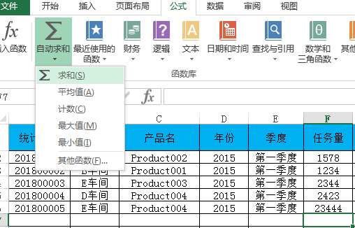 而对图二的F列进行求和就再简单不过了。选中F列数据,点击公式-自动求和-求和,就立马得到了结果。