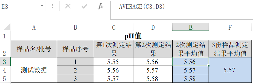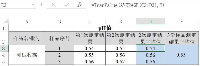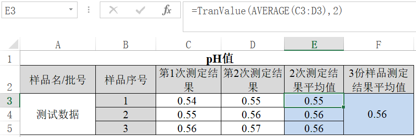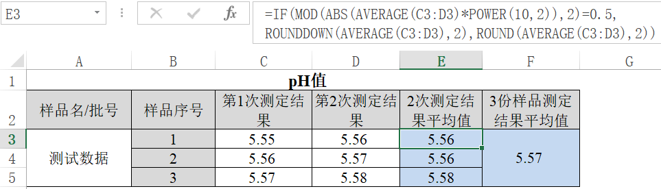 以一组实际数据为例,需要计算样品两次pH值测定结果的平均值,保留两位小数,直接运用AVERAGE函数即可,Excel默认的四舍五入修约规则得到的结果如下图所示: