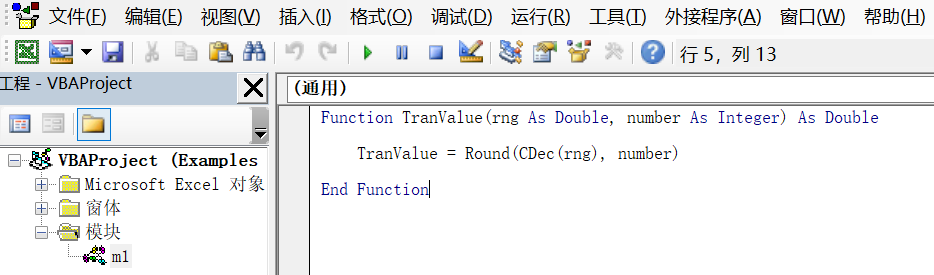 函数编写完,就可以在Excel工作表中引用TranValue(X,Y)该函数。其中,X为待修约的原始数值;Y为保留位数。